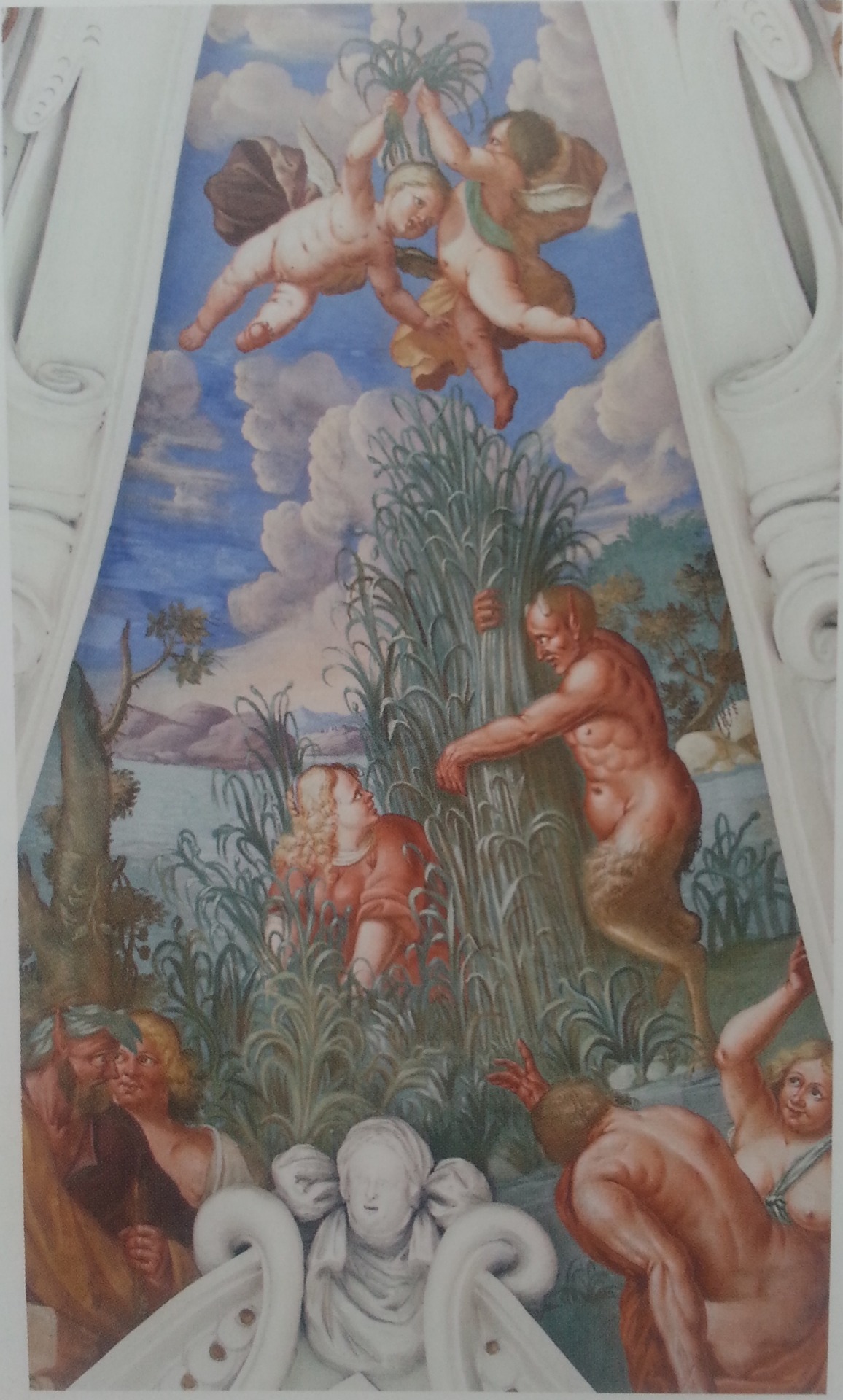 "Pán ji stíhal a neměla kam prchnout. A když mohutné říční proudy jí bránily běžet dále, sesterské říční víly jak prosila, aby ji celouzměnily, a jak Pán, pln víry, že Sýringu drží, místo nymfina těla měl v rukou jen rákosí vodní..."